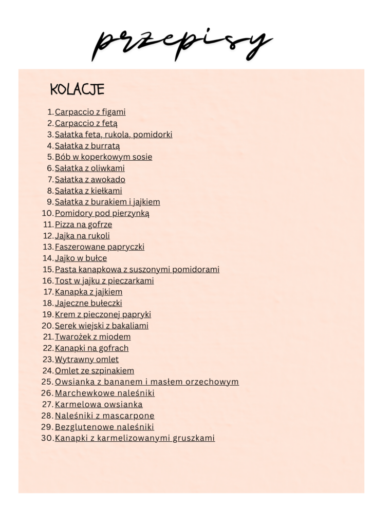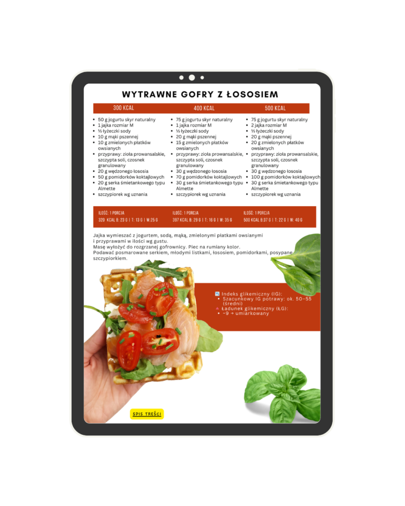 Masz gotowe pomysły na śniadania, kolacje, przekąski – podane w kaloriach, żeby nie musieć liczyć samodzielnie.
