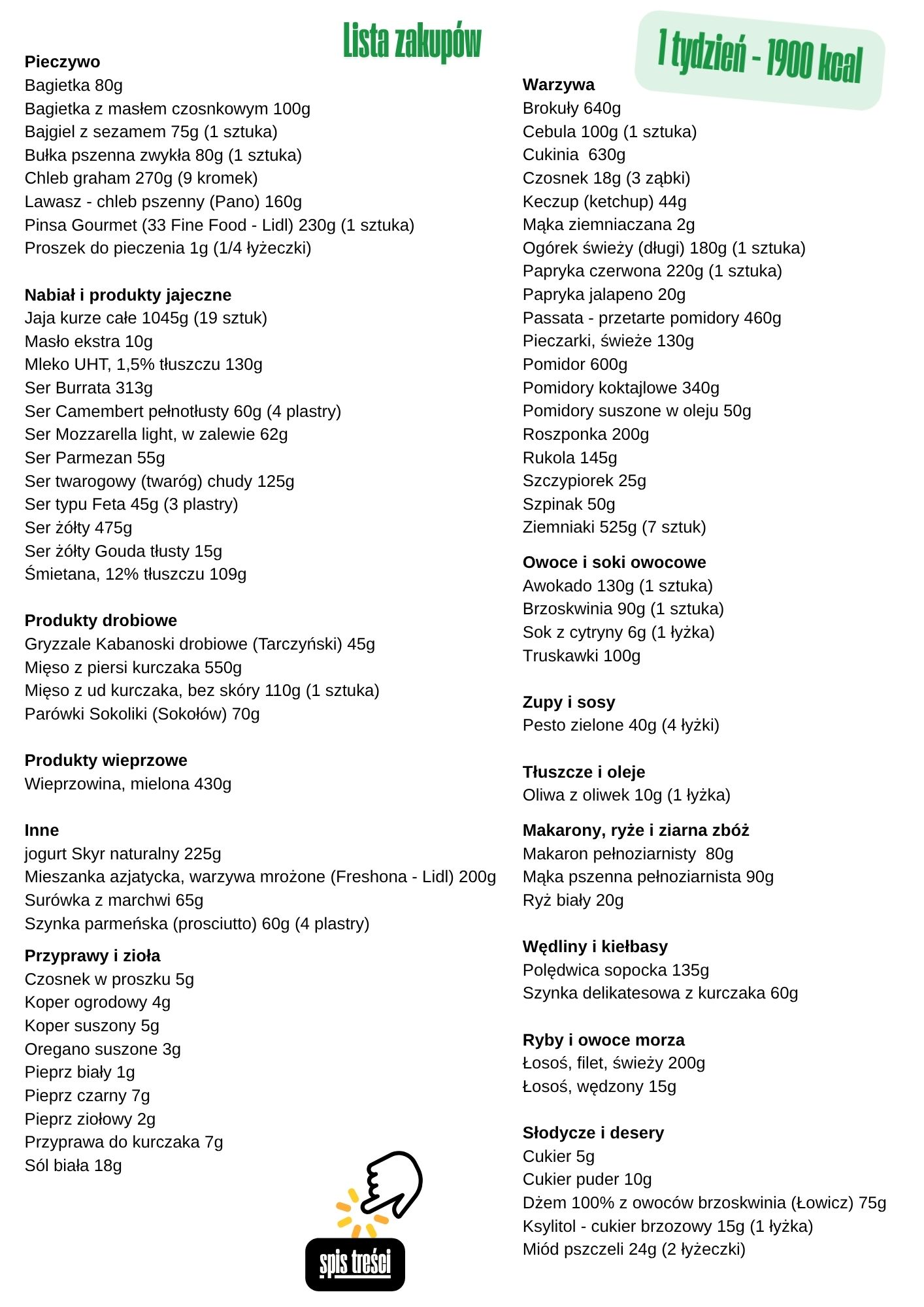 ✔ Lista zakupów do każdego tygodnia i każdej kaloryczności