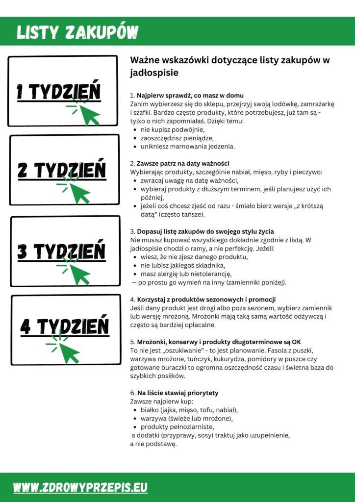 ✔ Lista zakupów do każdego tygodnia i każdej kaloryczności